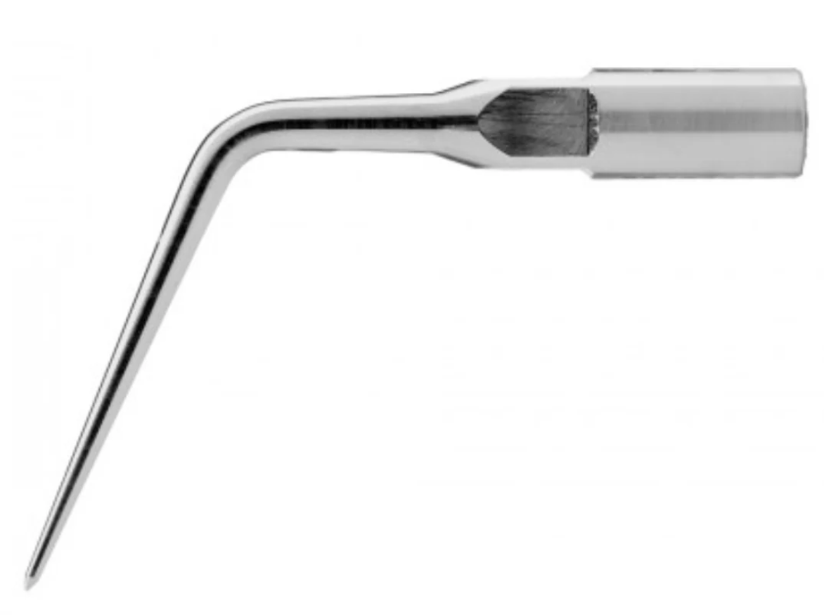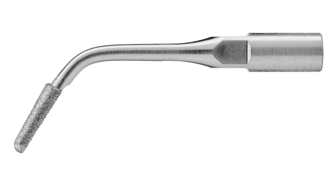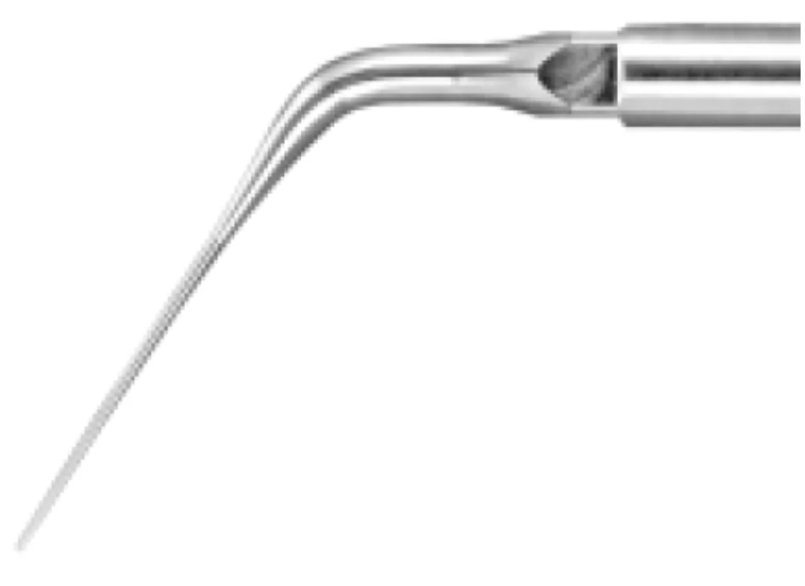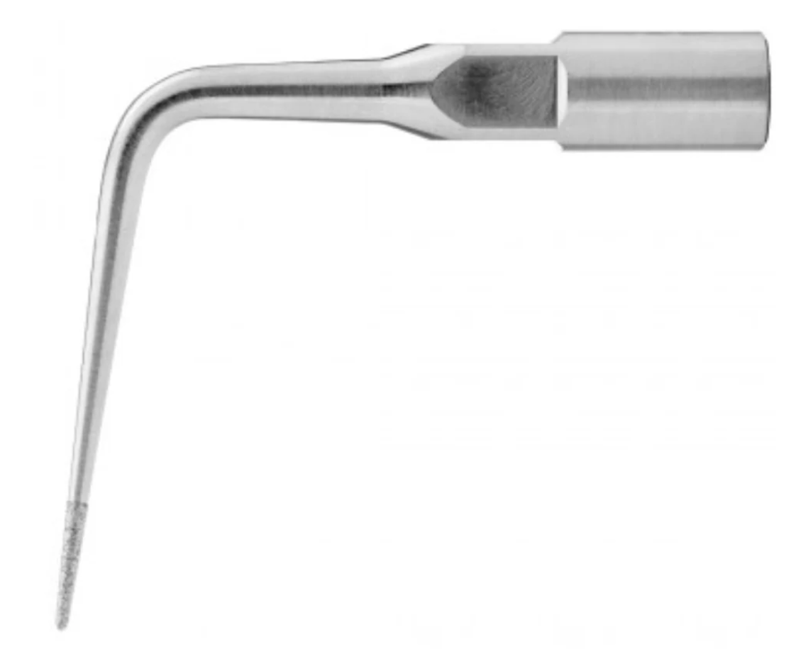 El inserto E6D tiene múltiples funciones y se puede utilizar en endodoncia, periodoncia y odontología restauradora. Su punta en forma de bala, con punta de diamante, permite ajustes precisos. Se utiliza ampliamente para localizar conductos, eliminar obstrucciones coronales, materiales de restauración, calcificaciones, cementos temporales y permanentes, postes, etc. Crea un surco limpio, liso y plano que facilita la localización del conducto. También se puede utilizar para eliminar caries y refinar márgenes y cajas de preparación para restauraciones.